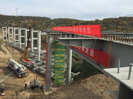 我公司承建的京藏高速公路改擴建段JZ15合同段,該標段的永寧黃河橋連接線分離立交主橋,為寧夏首座鋼—混組合箱梁橋。橋梁設計上部采用鋼—混凝土組合結構連續箱梁,主梁高3.1m,最大跨徑65m,單節梁段最重79t、長39m。本工程為寧夏區內單孔跨徑最大、建筑高度最高、單節梁最重、施工和吊裝難度最大的鋼混疊合梁橋,在技術和施工組織上有極具極大的挑戰性。