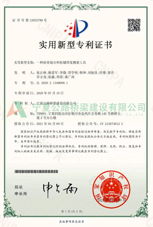 實用新型專利: 一種瀝青混合料松鋪厚度測量工具
