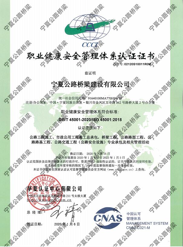 寧夏公路橋梁建設(shè)有限公司職業(yè)健康安全管理體系認(rèn)證證書(shū)