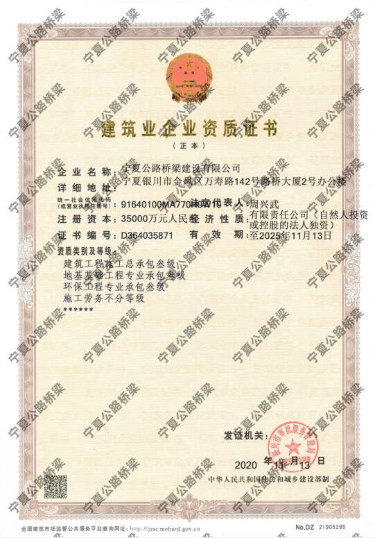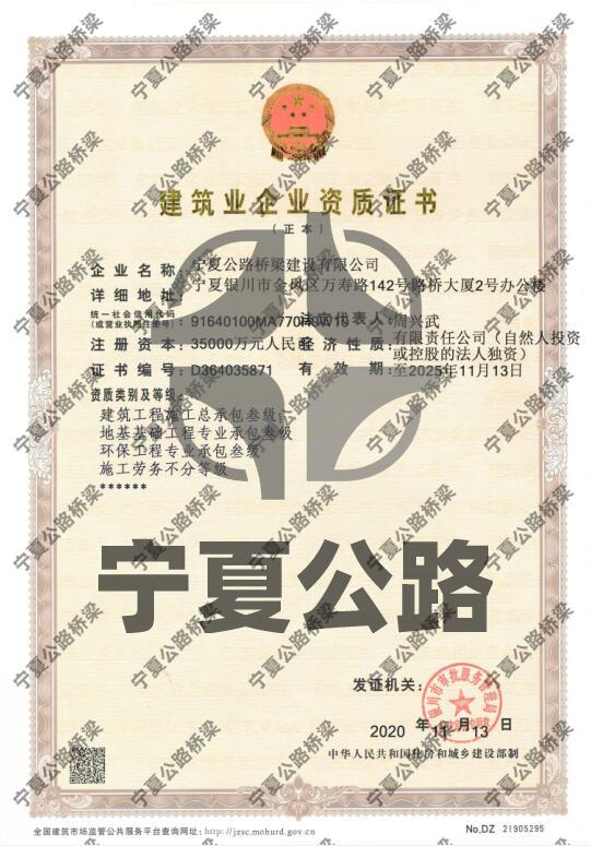 寧夏公路橋梁建設有限公司建筑業企業資質證書