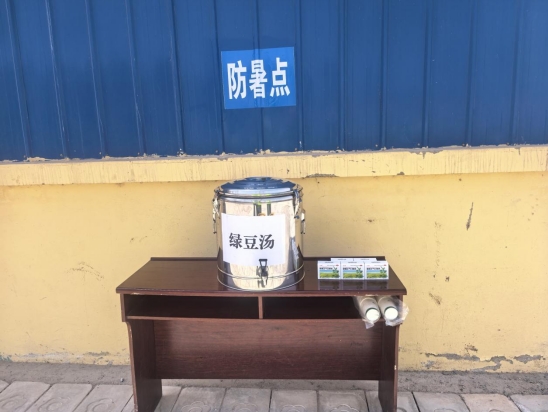 項目部精心準備了藿香正氣水、冰糖、綠豆、菊花茶等防暑降溫物資,第一時間發放到作業人員手中。在施工現場設置防暑點,建立防暑應急預案,儲備防暑降暑物資,全方位做好防暑降暑工作。