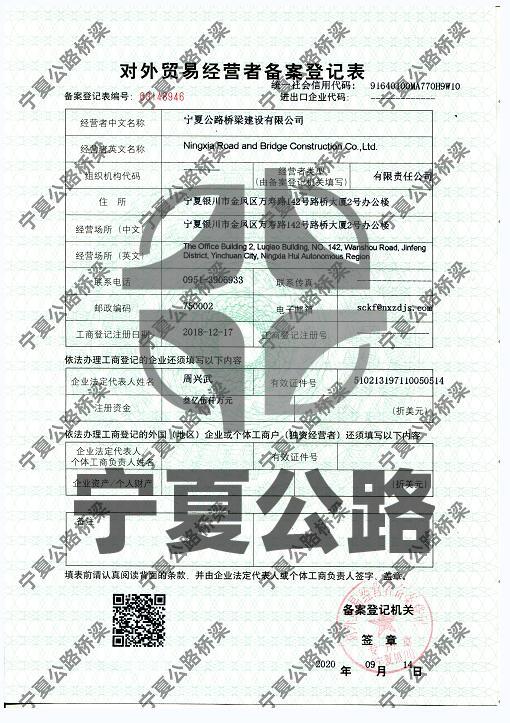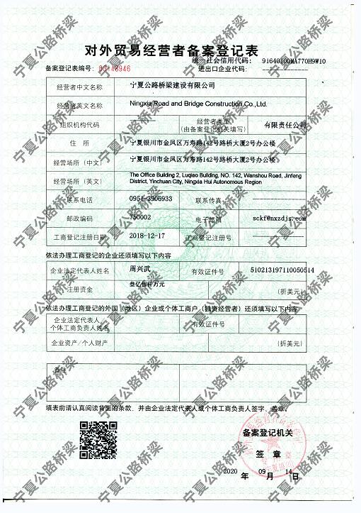 寧夏公路橋梁建設有限公司對外貿易經營者備案登記表