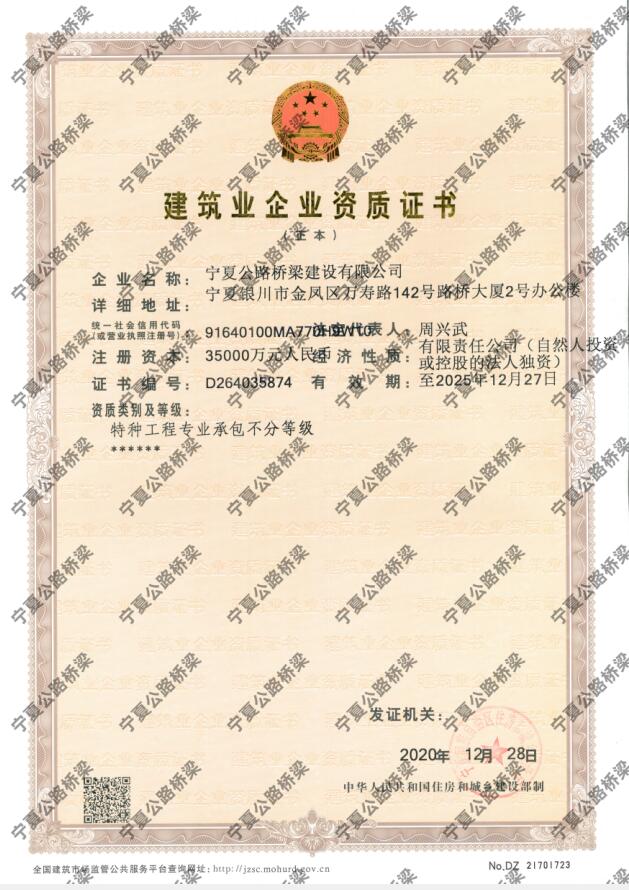 寧夏公路橋梁建設有限公司建筑業企業資質證書