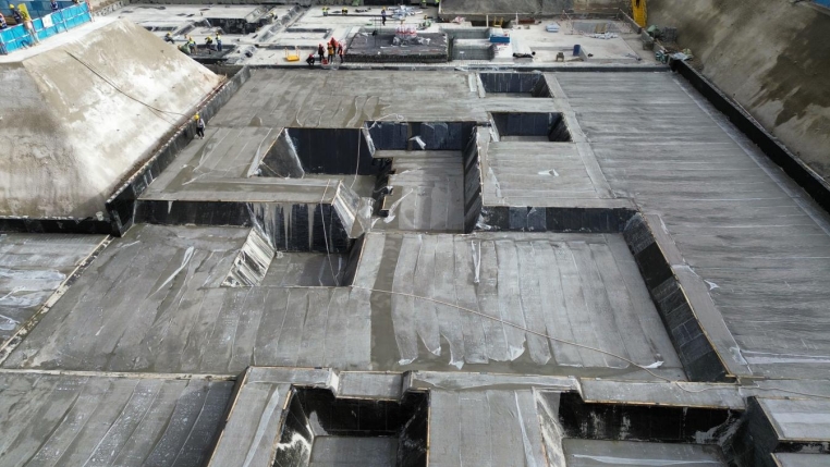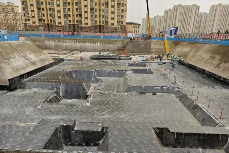 在防水工程中,項目團隊選用反應粘結型高分子濕鋪防水卷材(雙面粘)。該材料通過聚合物水泥和混凝土結構層發生化學反應和物理吸附,使卷材與混凝土基層形成“皮膚式”密實粘結。同時,該材料具有卓越的材料性能,抗拉強度高,延伸率大,對基層收縮變形和開裂的適應能力強,耐穿刺、耐硌破、耐撕裂等特點。適用于本項目復雜的施工環境,在近來的沙塵天氣依然可以施工,有效縮短了工期。